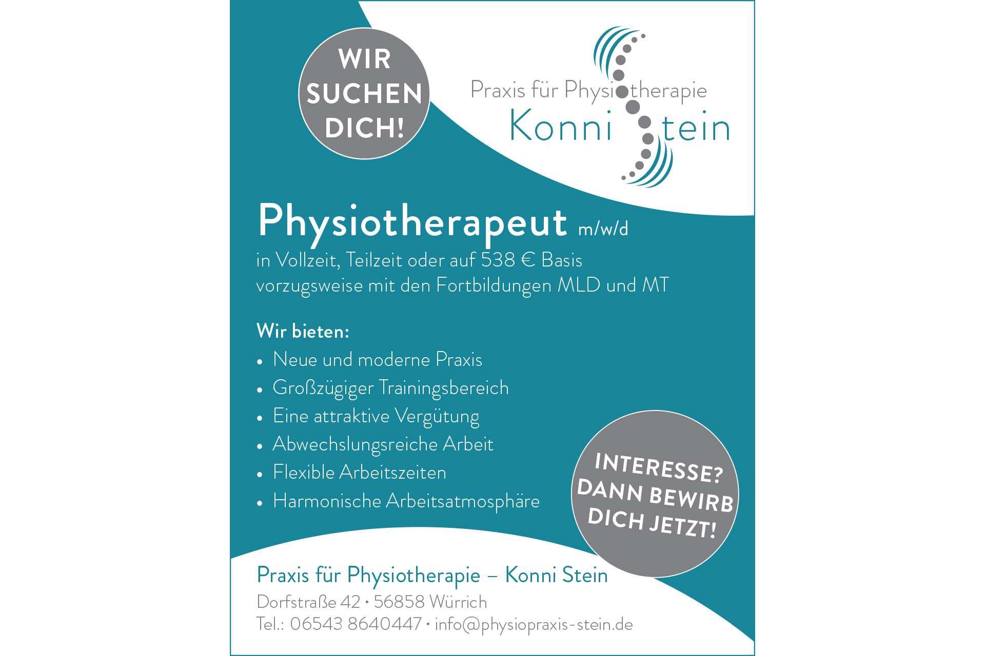 Eine ansprechende und zielgerichtete Stellenanzeige habe ich für die moderne Praxis für Physiotherapie – Konnie Stein entworfen. Die Praxis zeichnet sich durch ein zeitgemäßes Ambiente und innovative Behandlungsmethoden aus, was sich auch in der Gestaltung der Anzeige widerspiegelt.